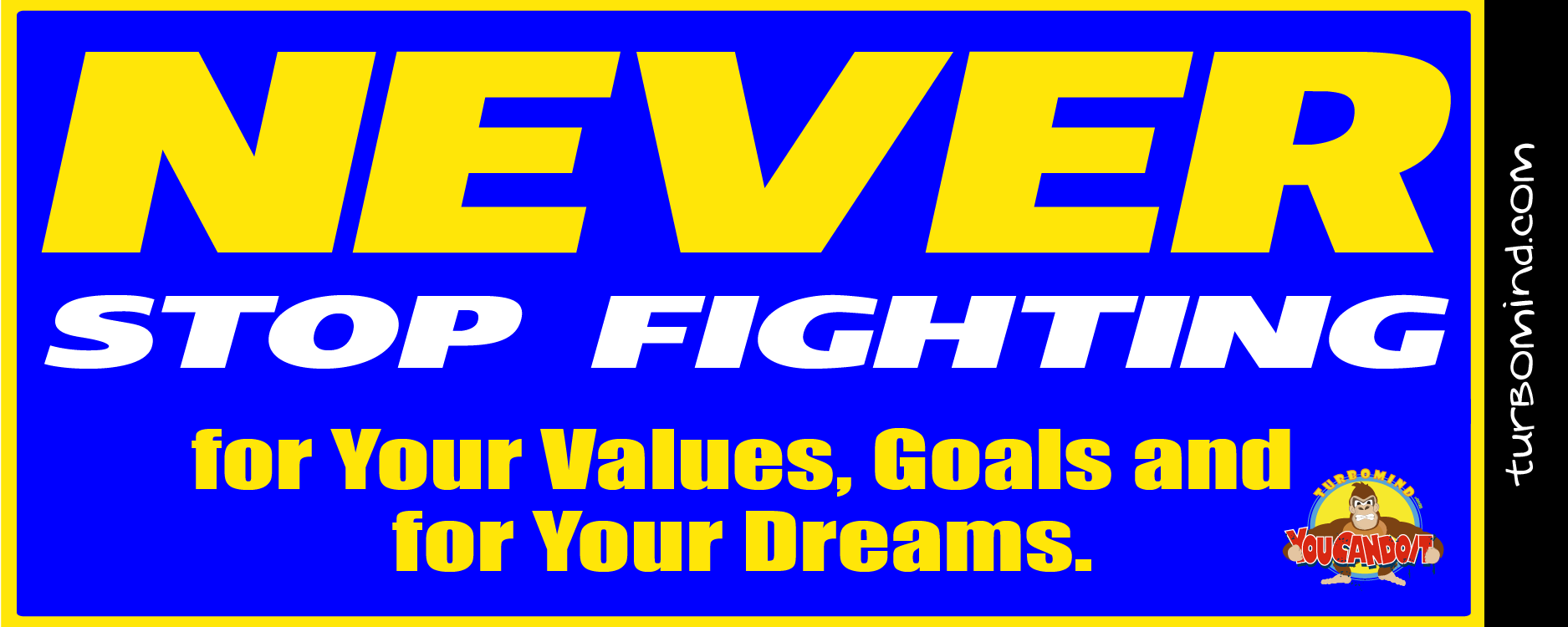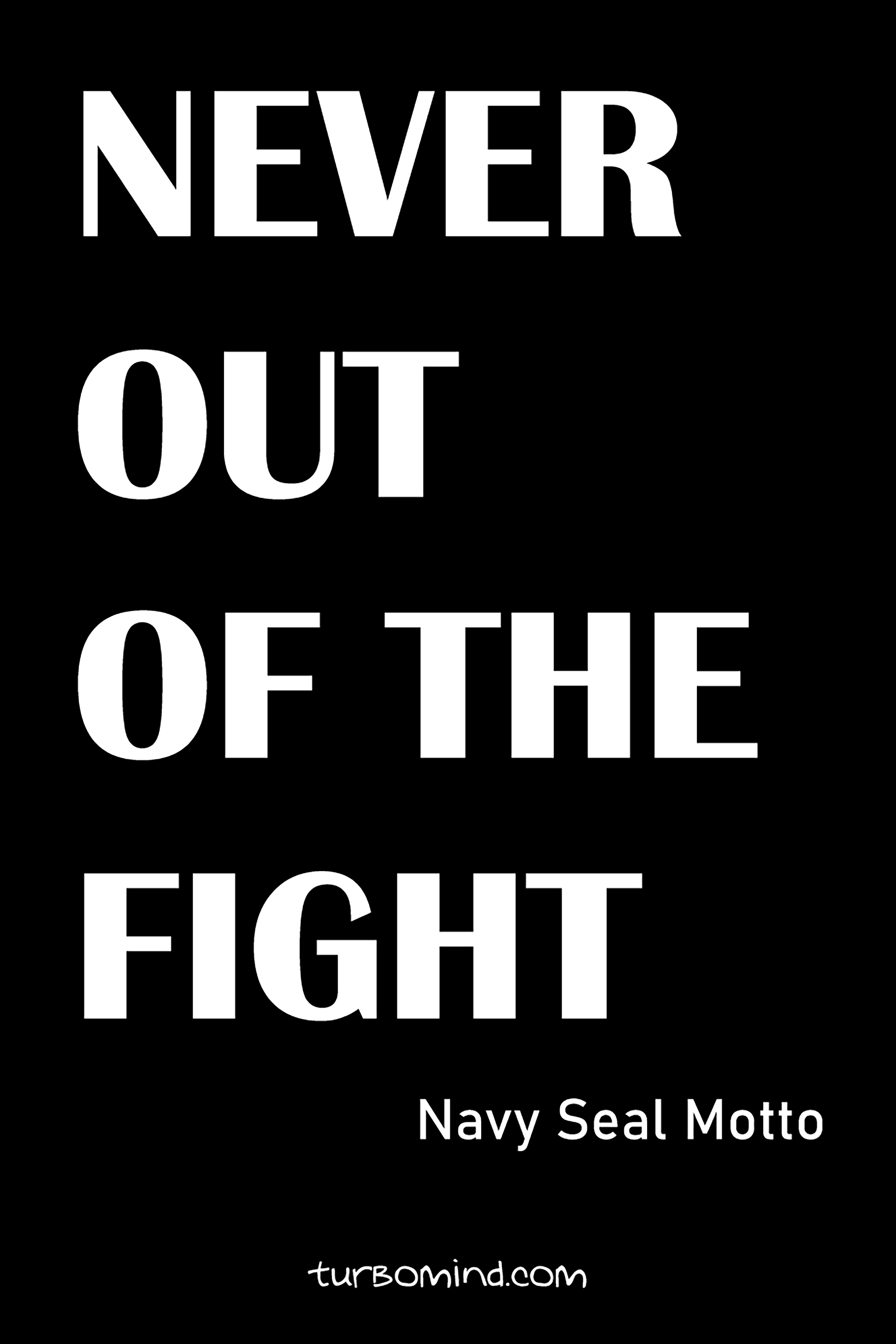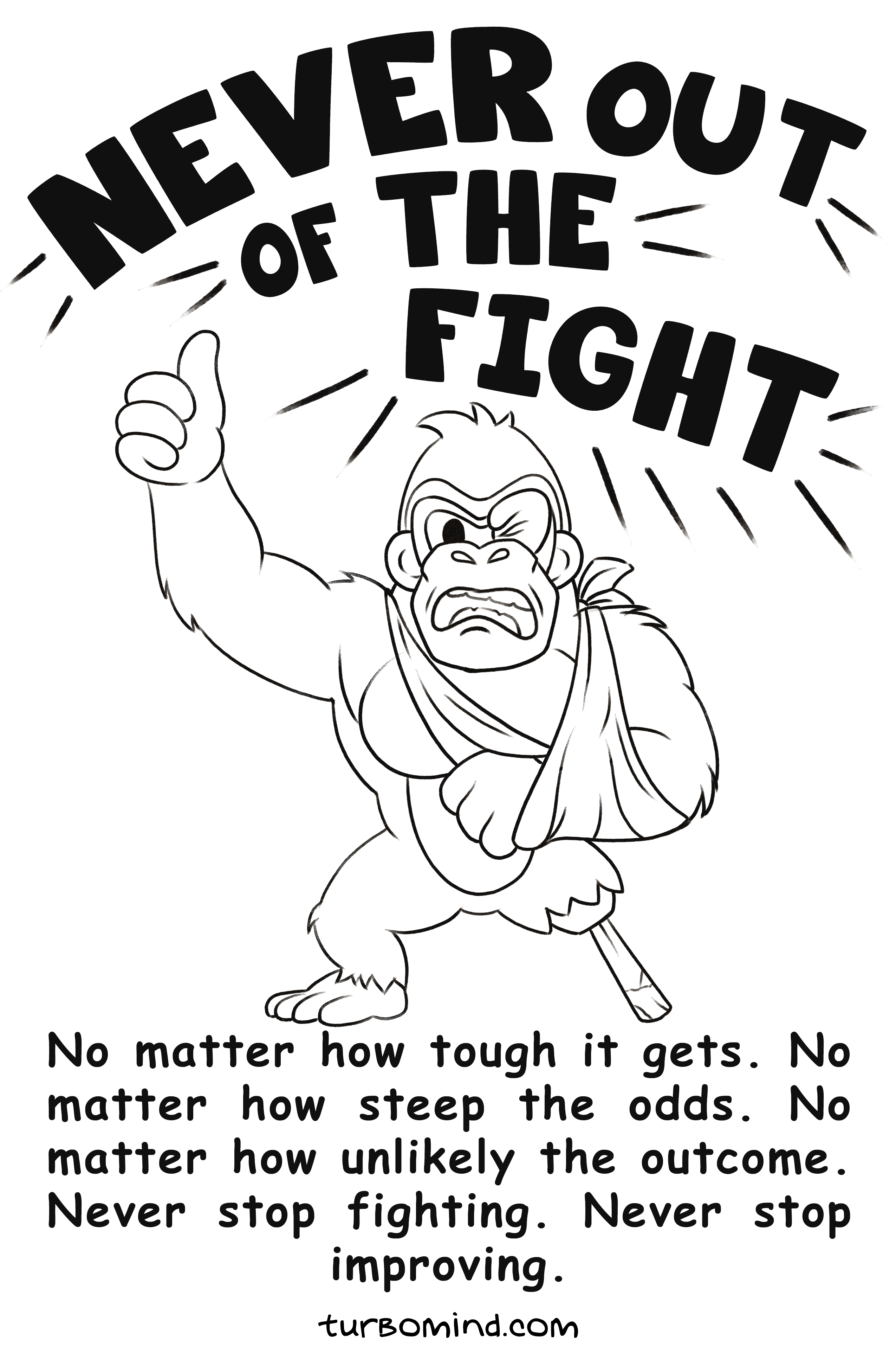 NEVER OUT OF THE FIGHT. No Matter How Tough it Gets. No Matter How Steep the Odds. No Matter How Unlikely the Outcome. Never Stop Fighting. Never Stop Improving.