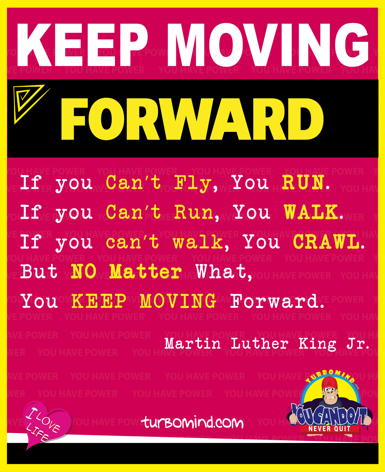 KEEP MOVING Forward If you Canβt Fly, You RUN. If you Canβt Run, You WALK. If you canβt walk, You CRAWL. But NO Matter What, You KEEP MOVING Forward. Martin Luther King Jr.