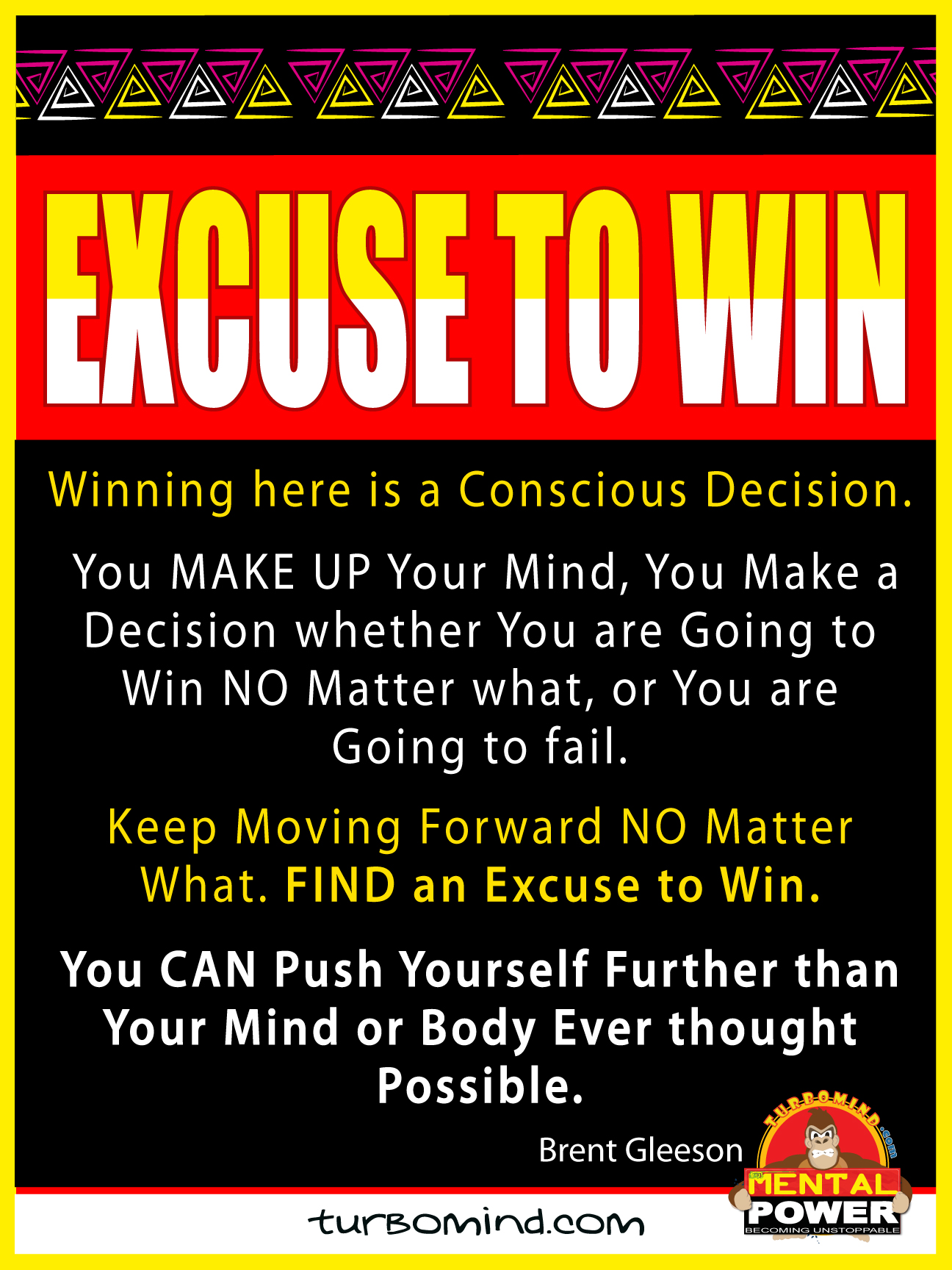 EXCUSE TO WIN Winning here is a Conscious Decision. You MAKE UP Your Mind, You Make a Decision whether You are Going to Win NO Matter what, or You are Going to fail. Keep Moving Forward NO Matter What. FIND an Excuse to Win. You CAN Push Yourself ... Learn More