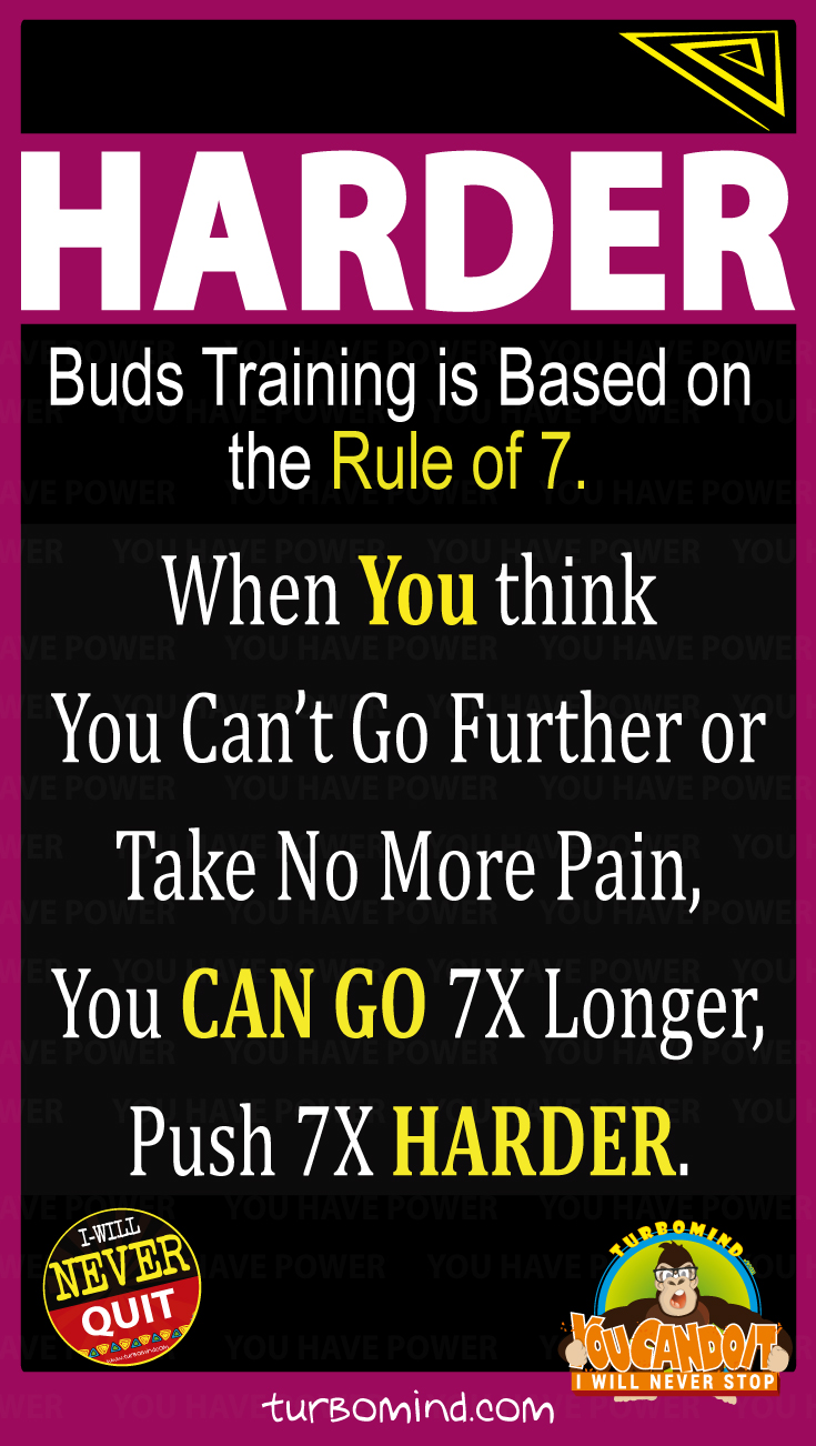 Buds Training is Based on the Rule of 7. When You think You Canβt Go Further or Take No More Pain, You CAN GO 7X Longer, Push 7X HARDER.