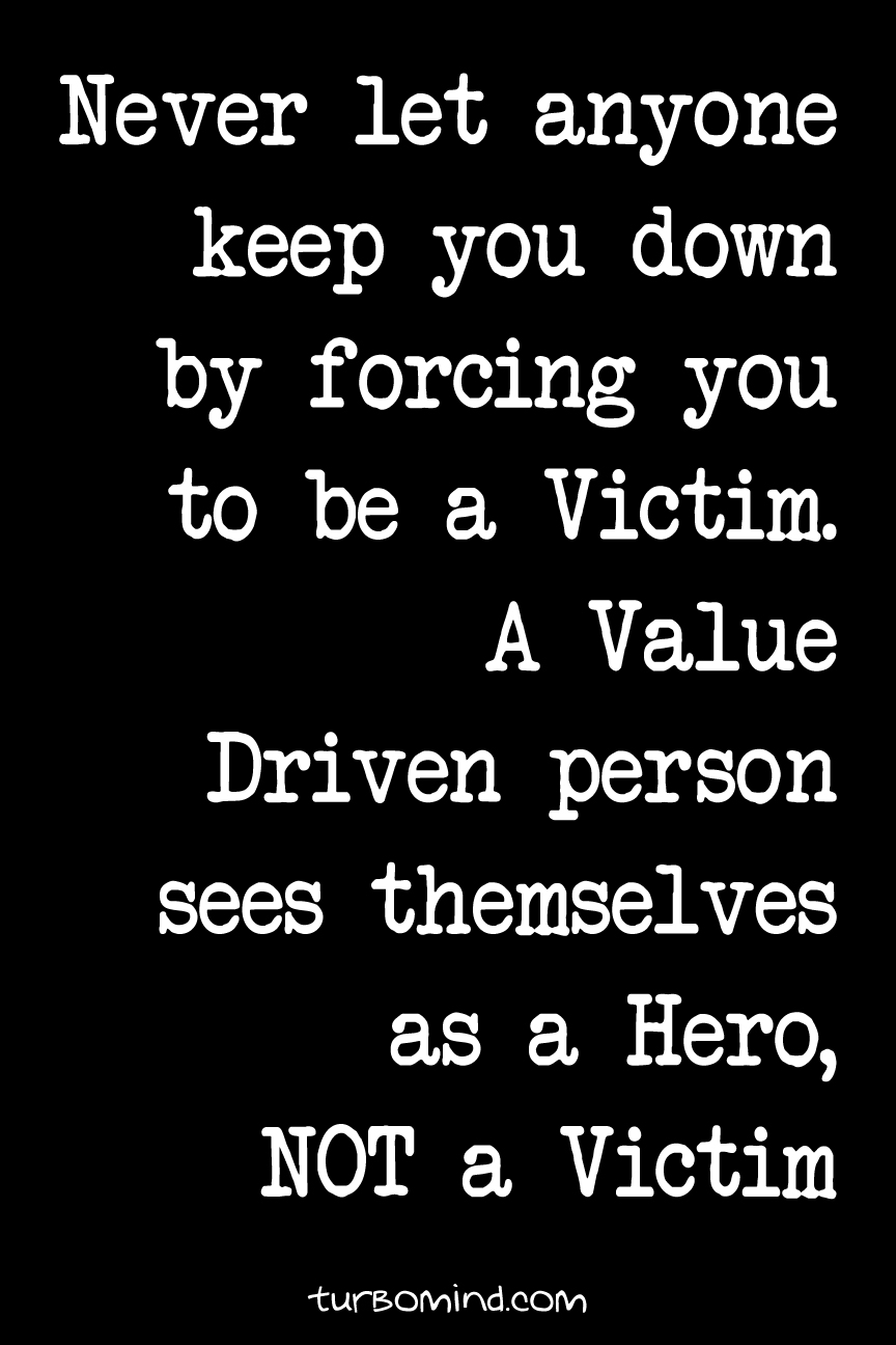 NEVER Let Anyone Keep You Down by Forcing You to be a Victim. A Value Driven Person sees themselves as a HERO NOT a Victim