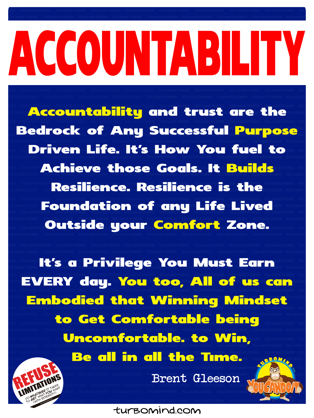 ACCOUNTABILITY Accountability and trust are the Bedrock of Any Successful Purpose Driven Life. Itβs How You fuel to Achieve those Goals. It Builds Resilience. Resilience is the Foundation of any Life Lived Outside your Comfort Zone. Itβs a Privile ... Learn More