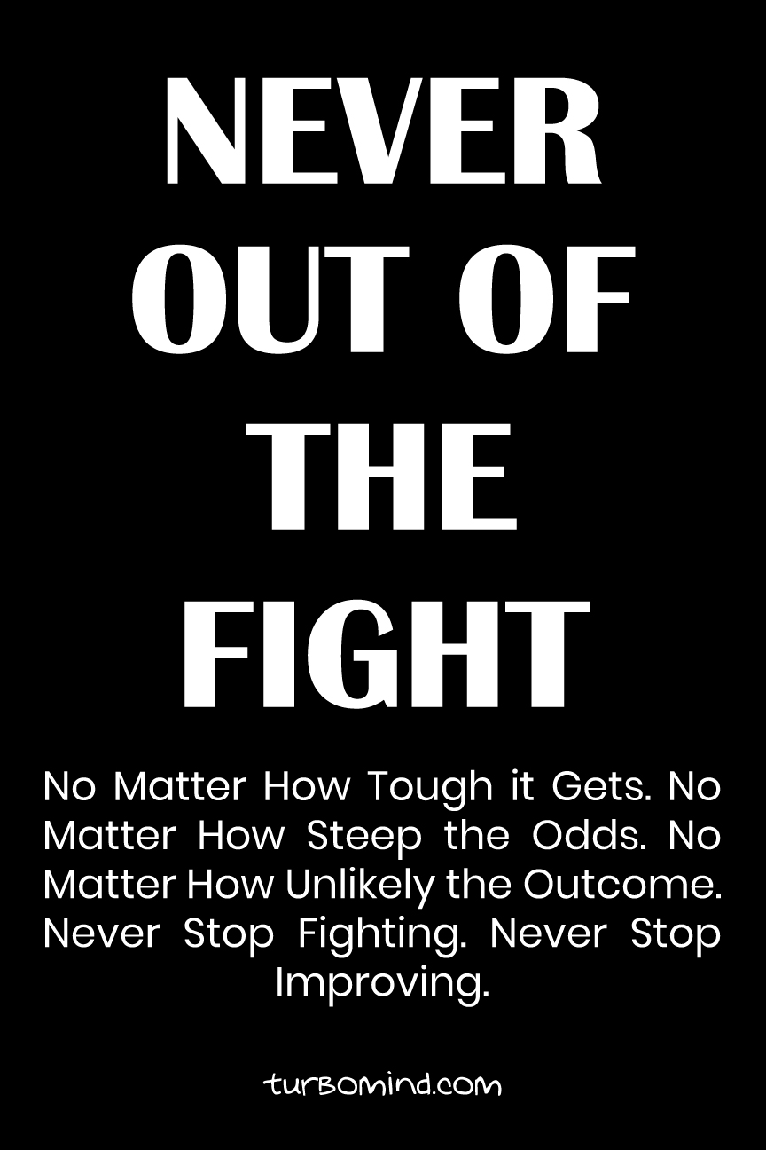 NEVER OUT OF THE FIGHT. No Matter How Tough it Gets. No Matter How Steep the Odds. No Matter How Unlikely the Outcome. Never Stop Fighting. Never Stop Improving.
